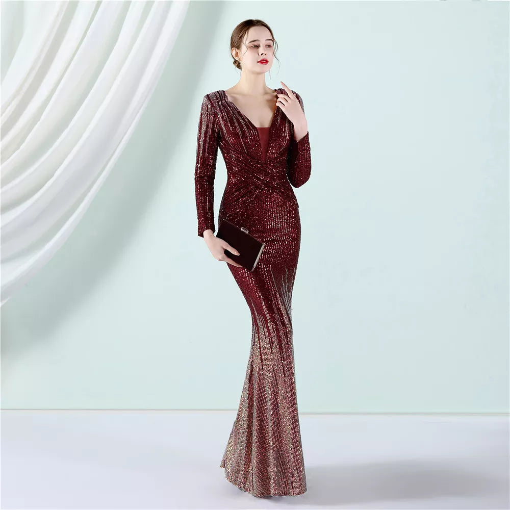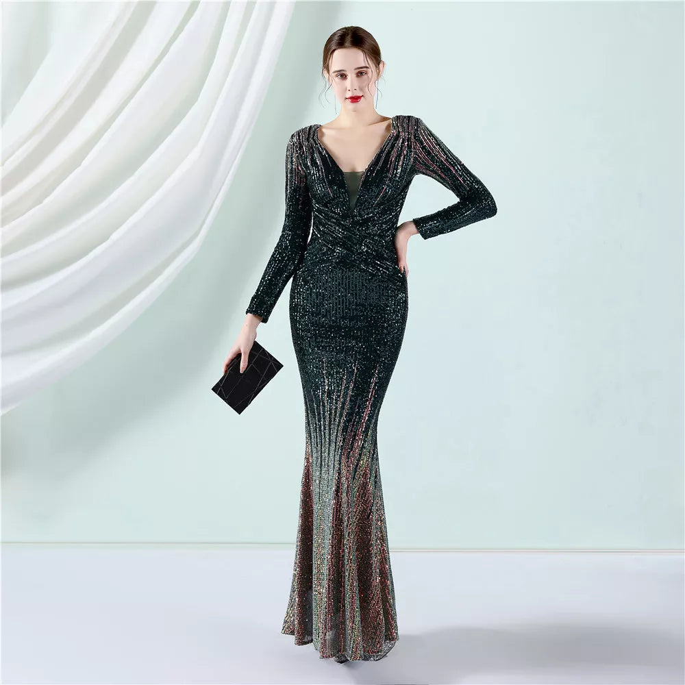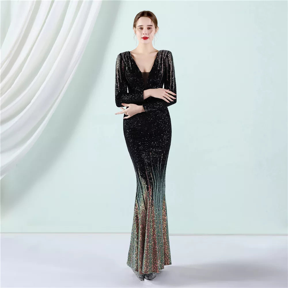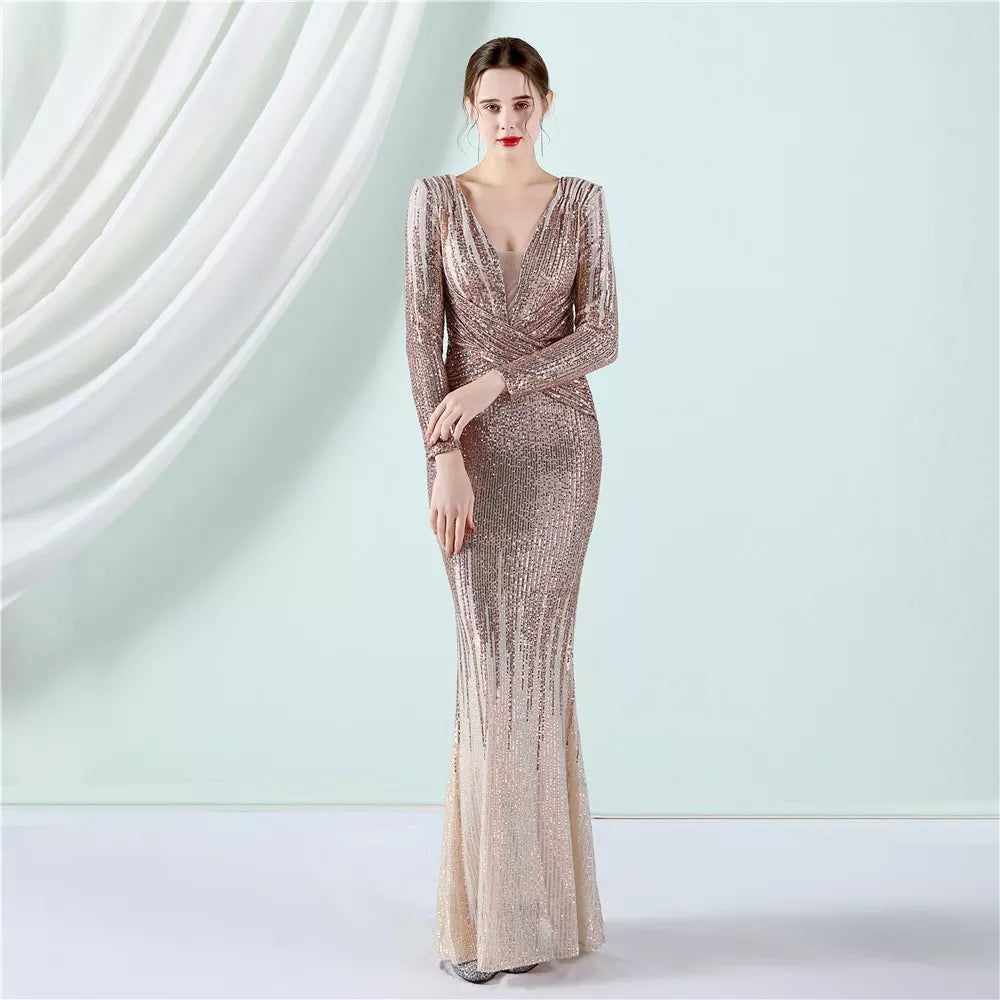 This gown is truly a showstopper with its art deco ombre pattern and stunning sequin fabric. With long sleeves and trumpet silhouette for an ultimate classy look.